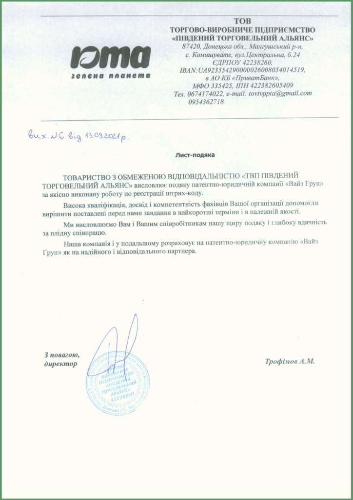Компанія «Вайз Груп» надала послуги з юридичного супроводу реєстрації штрих-кодів. У листі-подяці замовник відзначає високий рівень організованості, оперативність і відповідальність команди, завдяки чому вдалося досягти очікуваного результату в найкоротші терміни.