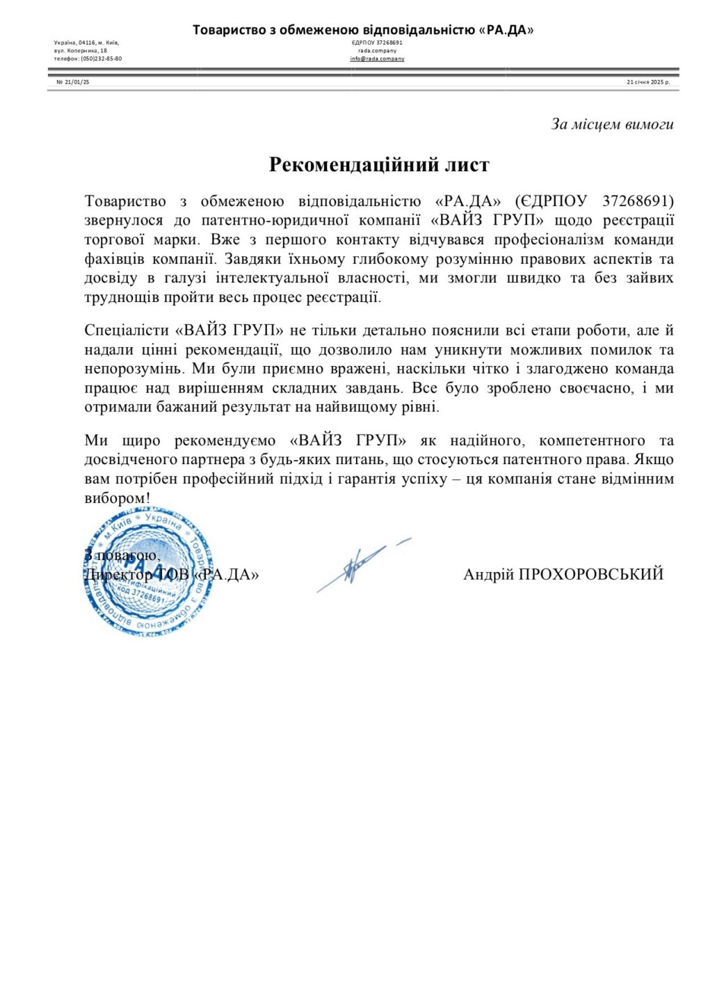 Після звернення до патентно-юридичної компанії «Вайз Груп» команда ТОВ «РА.ДА» отримала повний супровід у процесі реєстрації ТМ. У листі-рекомендації наголошено на високому професіоналізмі та досвіді фахівців, глибокому розумінні правових аспектів, чіткості та злагодженості роботи команди. Особливо відзначено здатність пояснювати складні етапи, давати практичні рекомендації та уникати помилок.