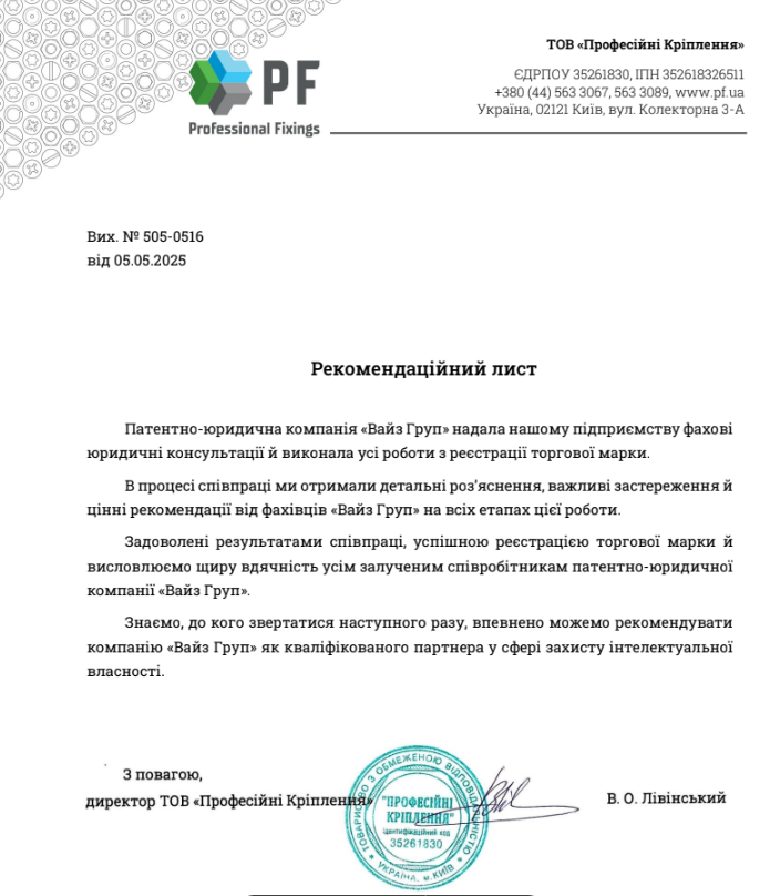 Патентно-юридична компанія «Вайз Груп» надала послуги з оформлення документації для реєстрації ТМ. У листі-рекомендації відзначено професійний підхід, високу кваліфікацію команди, а також дотримання строків і законодавчих вимог.